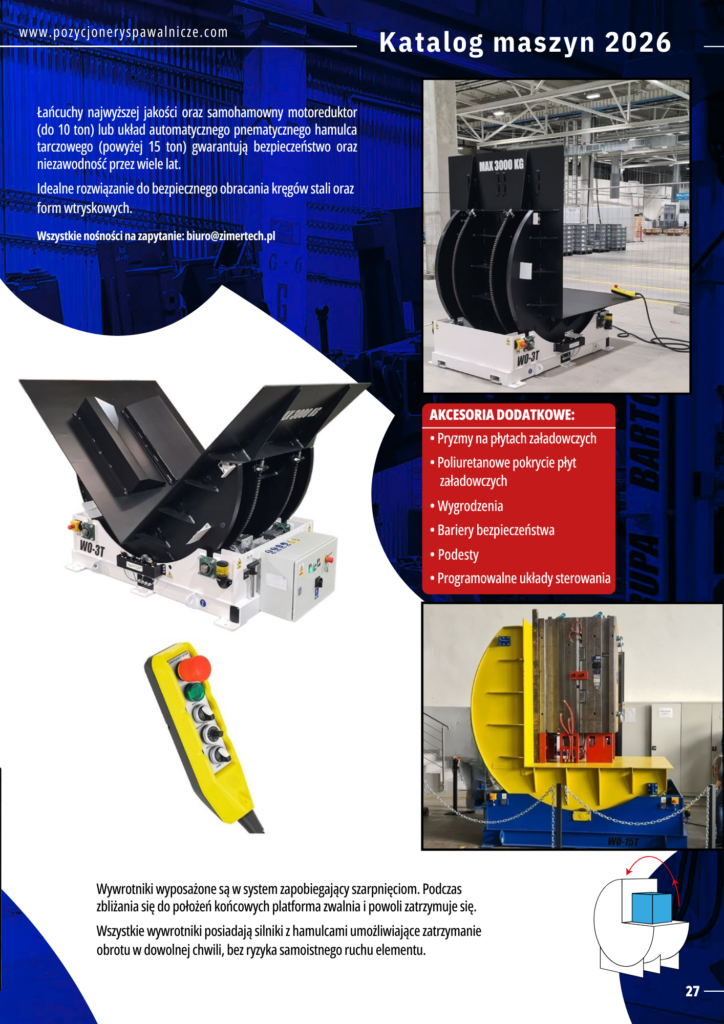 Jako producent oferujemy wywrotniki w różnych wariantach, dopasowanych do potrzeb odbiorcy. Szeroki wybór konstrukcji płyt załadunkowych (gładkie, pryzmy, uchwyty, zaokrąglone) pozwala na bezpieczne obracanie elementów o zróżnicowanej geometrii.